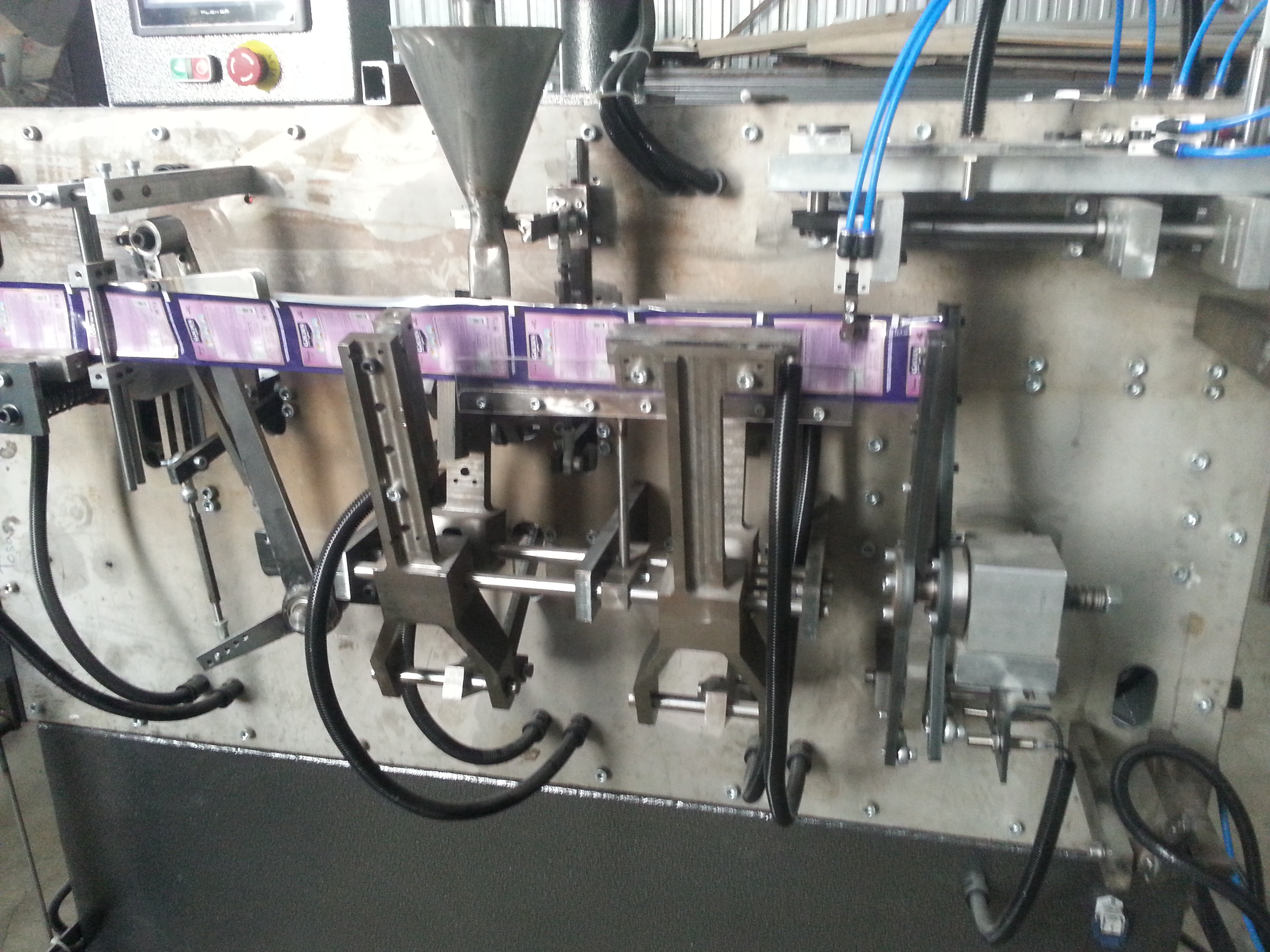 PLC kontrol sistemi, dokunmatik ekran, sıçaklık kontrolü, otomatik pnömatik bileşenler, otomatik adet kontrolü, paket gramaj ayarlama, bobin hız ayarlama, dc motorları ve servo motorların hızlarının ayarlanması dokunmatik ekranda yapılmaktadır.